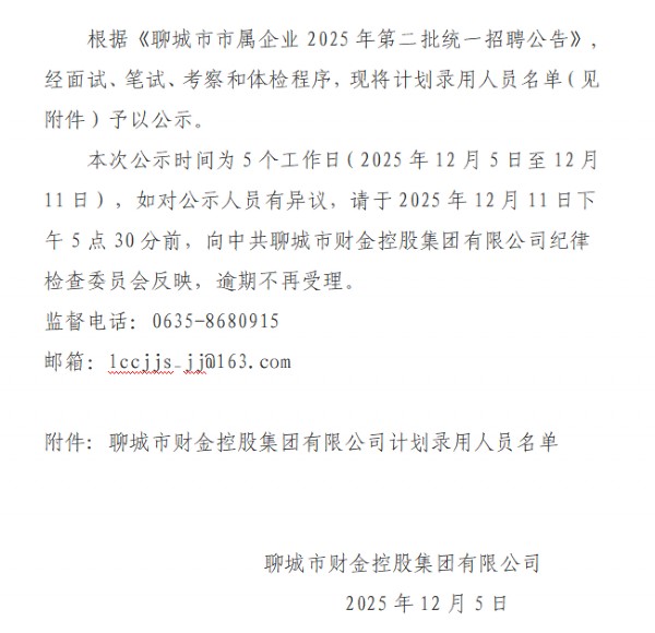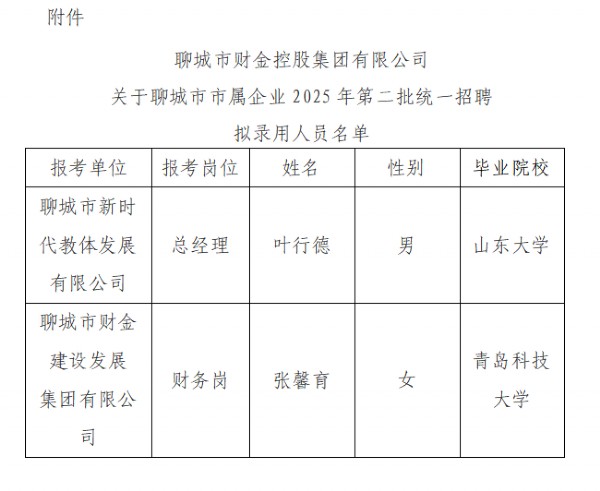 聊城市財金控股集團有限公司關(guān)于聊城市市屬企業(yè)2025年第二批統(tǒng)一招聘公告擬錄用人員公示